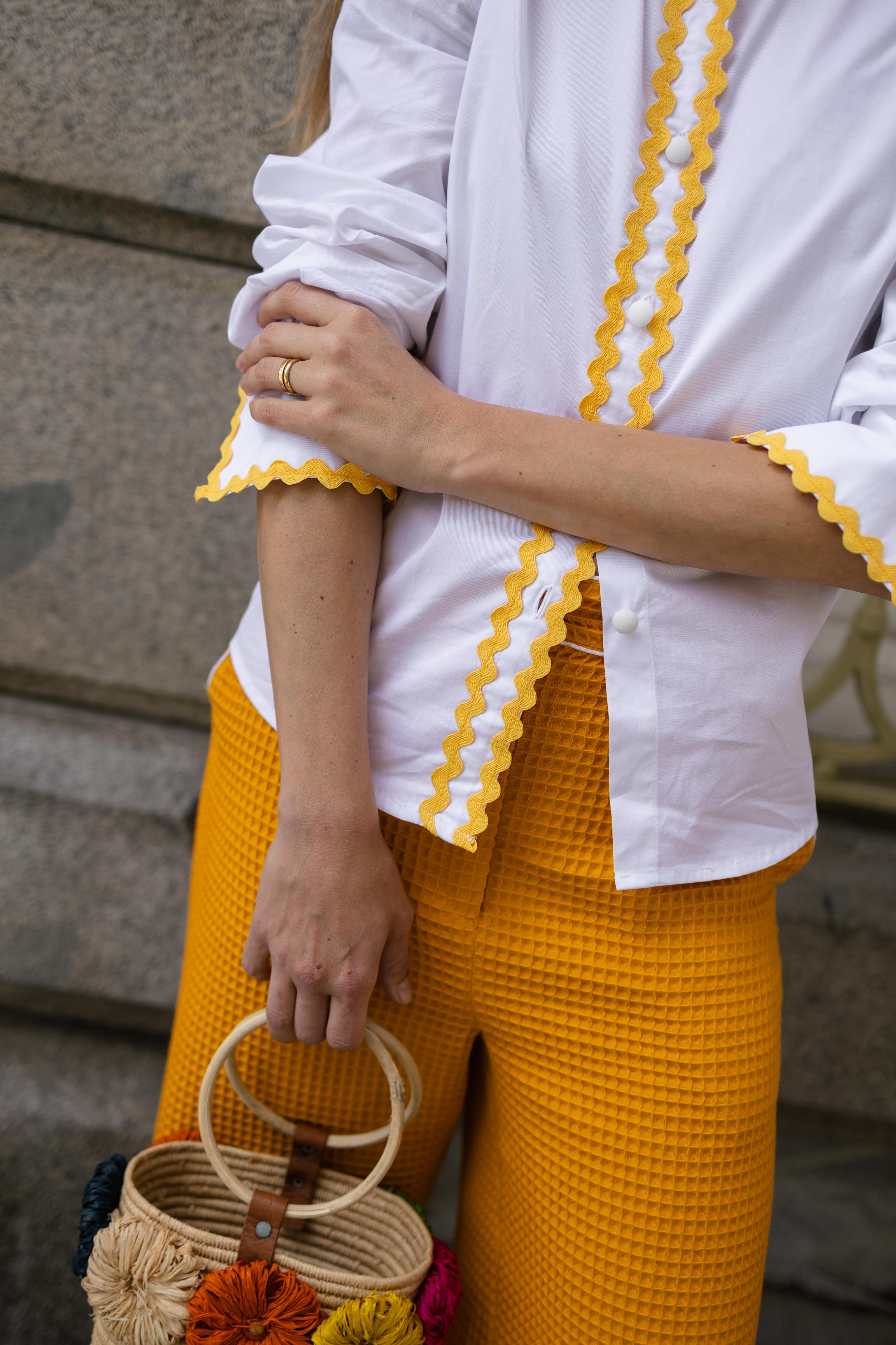 Made in Spain from crisp white cotton poplin, the Almu shirt features a vibrant yellow rick-rack trim, a joyful detail that brings warmth & charm to this tailored essential. Whether paired with jeans or colour-blocked trousers, it’s the kind of piece that makes every day feel brighter: